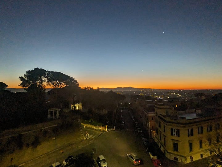 Sunrise over Rome, seen from a terrace above Trastevere. The light of a new day lifting the city out of darkness. A city whose history is written in blood, beauty and stone, and the power and glory of the gods. Where pilgrims and tourists come with their burdens of faith and doubt, their yearnings for eternity and their restless quest for novelty. Sight…