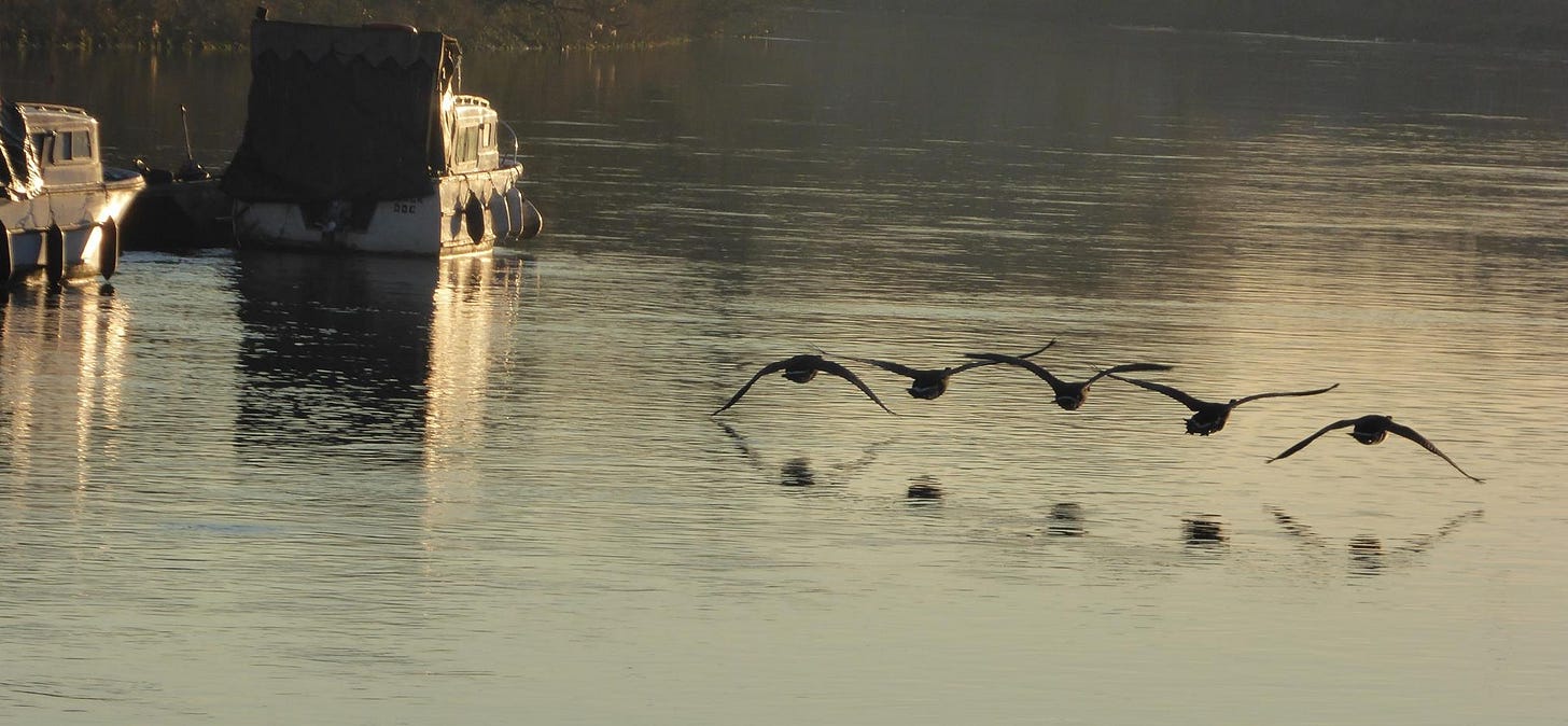 They make me wistful for the years when I lived on a houseboat on the tidal Thames in London, where the geese were my constant companions.