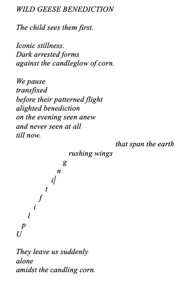 The call of the geese that heralds the coming of autumn, the forgetfulness of the smell of Blue Grass, the fading taste of summer like berries on the tongue, the drawing in of darkness as winter creeps over time’s invisible lines. There is never a now that is not also past, never a memory that has not already taken flight into imagination to shape the seasons of the future, arrowing through time like wild geese migrating.