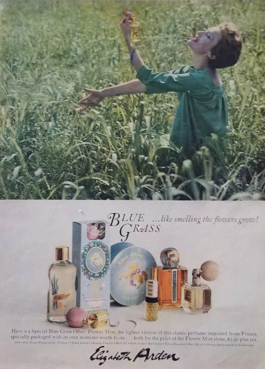 Pullman’s mother wore a perfume called Blue Grass. It would, he said, be a Proustian moment to smell it again. My mother also wore Blue Grass. How could I have forgotten? It was the smell of my childhood, the smell of presence and comfort, the smell that lingered when my sisters and I were left to sleep in the car while our mother and father went to those glamorous places where grown-ups went. Today, that might be seen as neglect, but we loved those nocturnal adventures, snuggled up with blankets in the station wagon with the seats folded down and a supply of snacks to keep us going, while through the windows we could see the distant swirl of their dancing and hear their laughter and music.