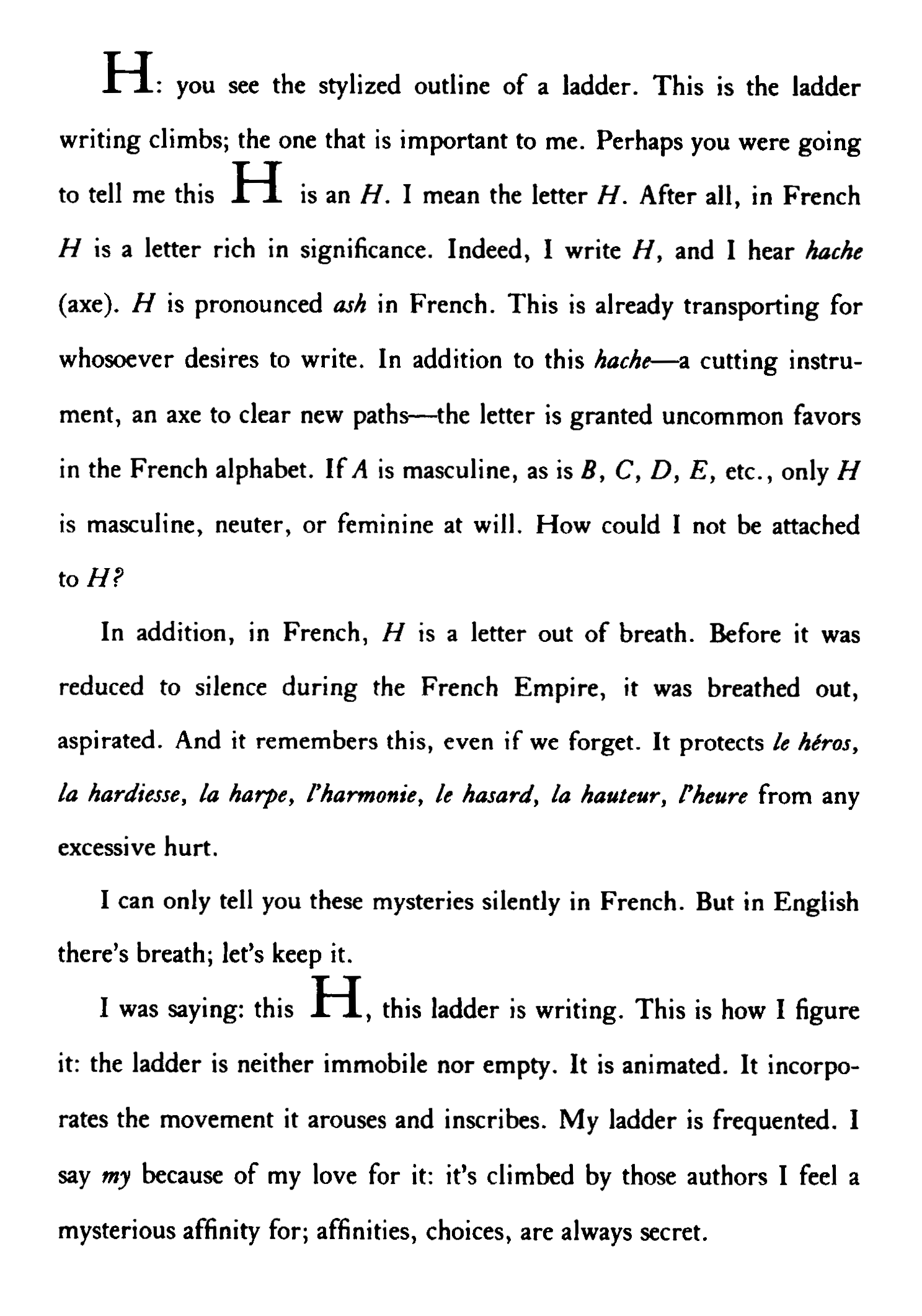 Two “I”s conjoined to make space for a third—a third that knows how to be silent, a third that knows when silence renders it visible. The H asperé that hides itself in speech and reveals itself in writing. The H that moves close to the consonant to render it sibilant. The H that unleashes the constant signifier and lets it flow into new channels of meaning and communication. The H that allows the ear to hear, if only it knows how to listen to what is not said, to understand how that visible silence changes everything.